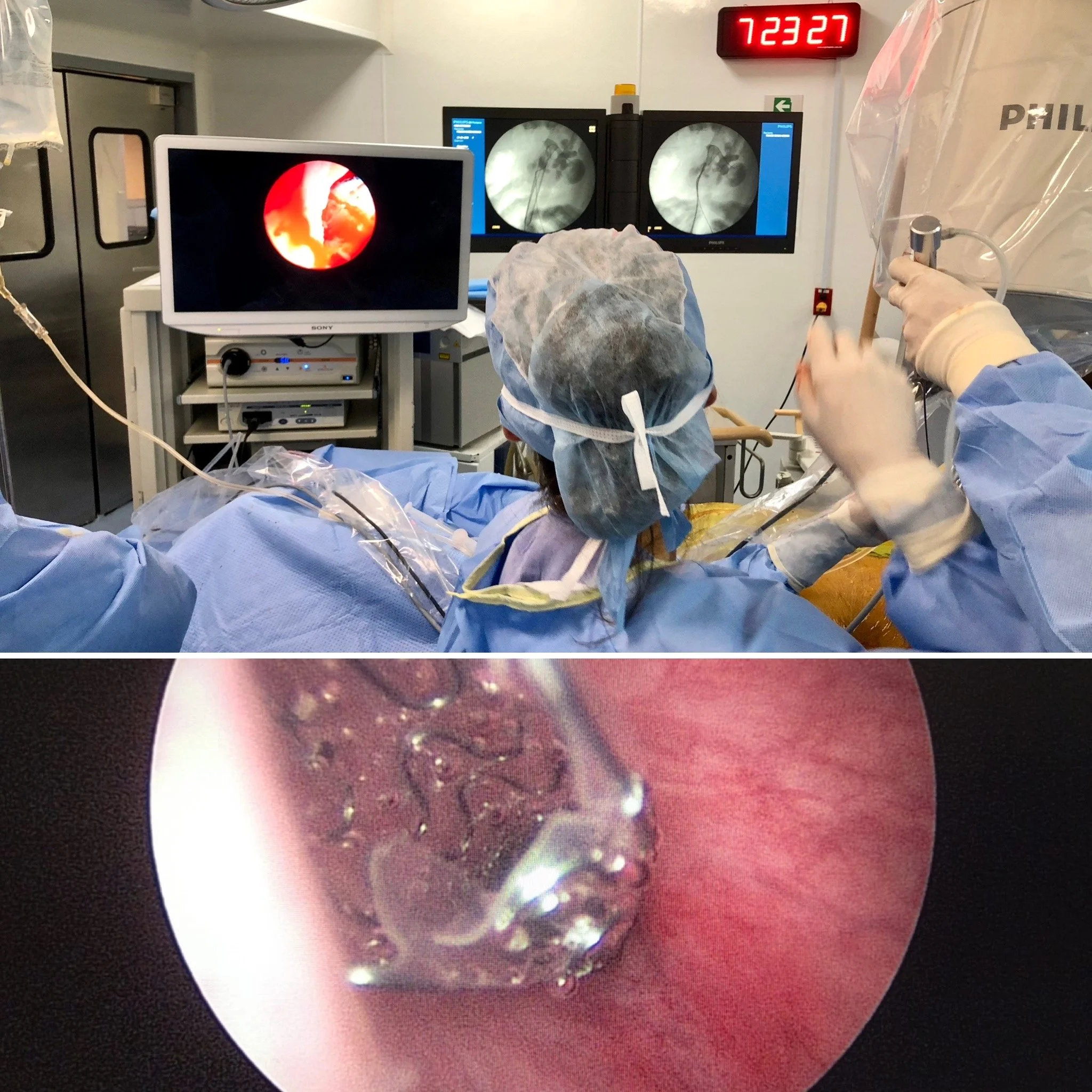 Este procedimiento se realiza para pacientes que presentan una carga litiásica tan grande, y/o que además, el acceso por NLPC y la anatomía renal del paciente, no permiten llegar a ciertas zonas del riñón.